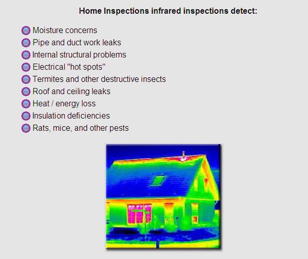 Thermography is the use of an Infrared imaging and measurement camera to "see" and "measure" thermal energy emitted from an object. It is not a moisture meter, and does not "see" moisture. The camera helps the inspector see temperature differences and abnormalities which can be caused by moisture. When two areas composed of the same or similar materials experience changing ambient temperatures, the area with the higher thermal mass (usually moisture) will change temperature more slowly. We let water run through the drains of the toilets, sinks, showers, and dishwasher. Depending on the ambient conditions at the house at the time of inspection, we may run hot or cold water. If the house is cold, hot water will show up better than cold water. We may use heating or A/C system to help change the temperatures in the house. The dry areas with less thermal mass will change temperature quickly. Areas with a higher thermal mass, which may include damp areas, will change temperature slower. These differences will be obvious when viewed through the Infrared camera.